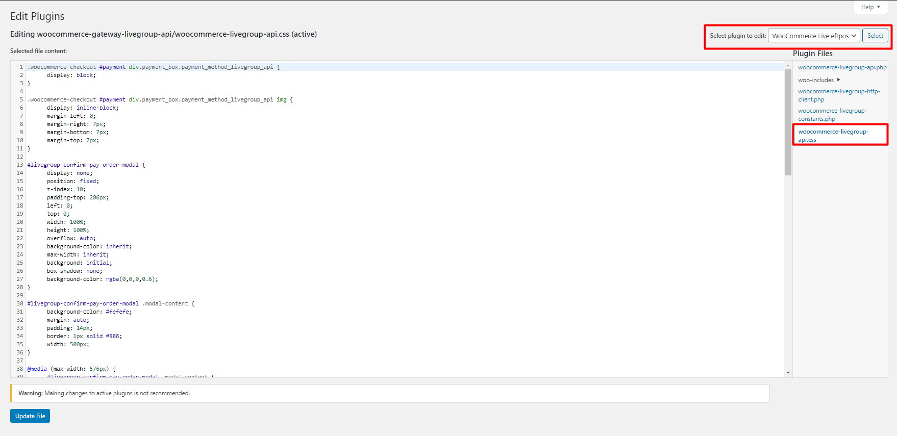 From the Select plugin to edit drop down box, select the WooCommerce Live eftpos Payment Gateway, then select woocommerce-livegroup-api.css.
